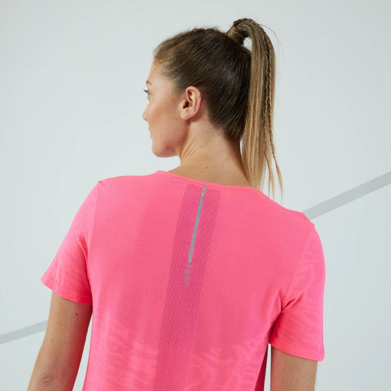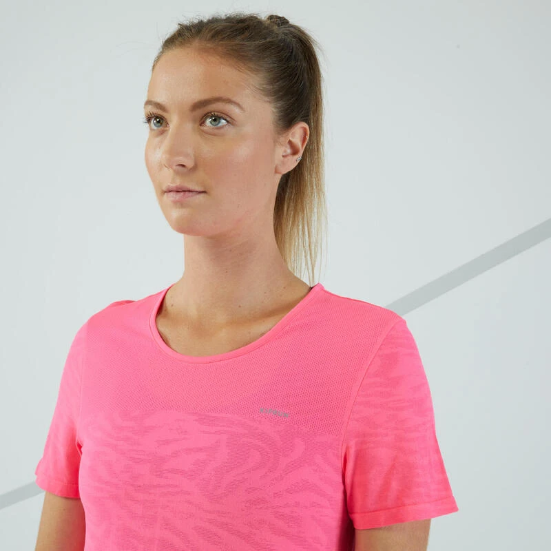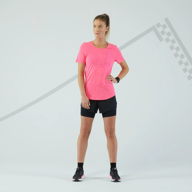 8772270Onze productontwikkelaars ontwierpen dit lichte en ademende hardloopshirt met korte mouwen voor dames, voor hardlopen in warm weer.Op zoek naar comfortabele, hoogwaardige hardloopkleding? Dit hardloopshirt is bijzonder comfortabel door de irritatiewerende materialen, de weving en het lage gewicht.
