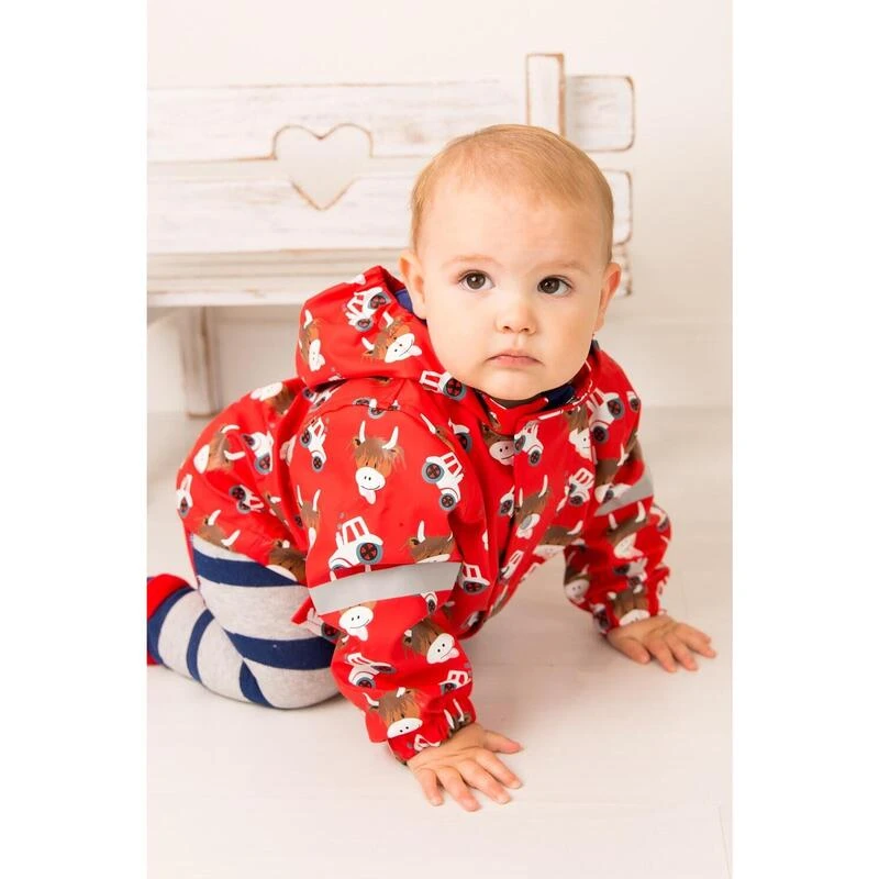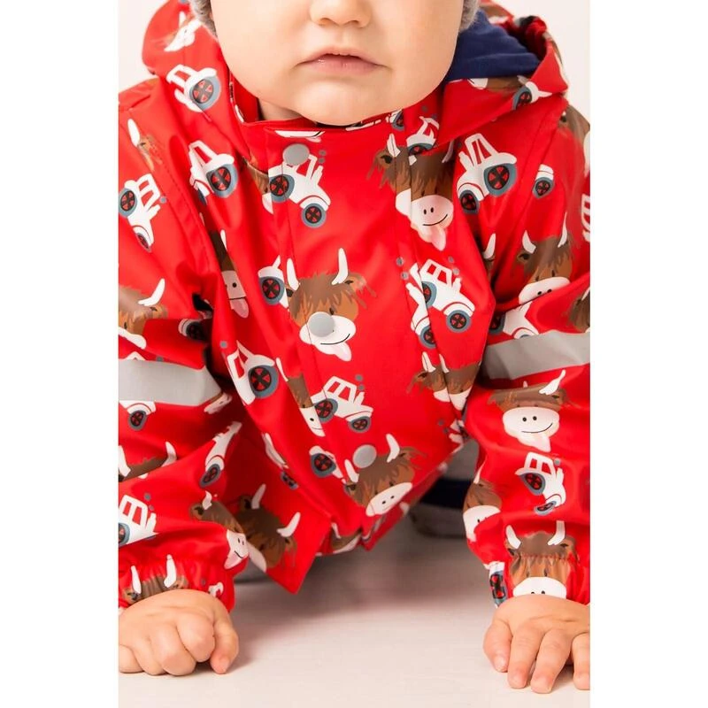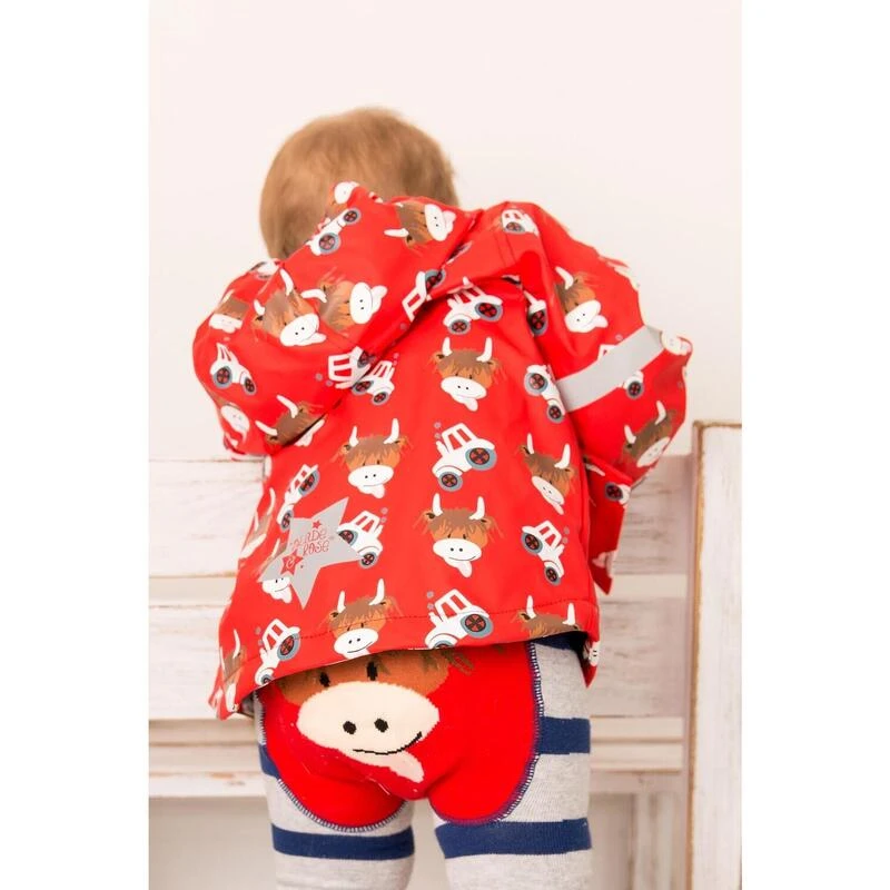 Deze vrolijke rode jas met onze ondeugende Highland Cow erop is een must voor elke kleine avonturier.