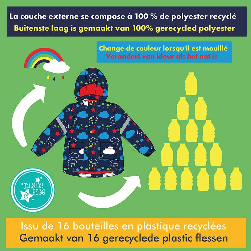 De buitenste laag is gemaakt van 100% gerecycled polyester. Gerecycled polyester (vaak aangeduid als rPet) wordt gemaakt van gerecyclede plastic flessen.Volledig gevoerd in contrasterende kleur