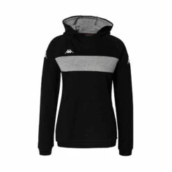 Trainings sweatshirt voor dames 65% katoen 35% polyester, SLIM FITLange mouwen, capuchon, kangoeroezak. Gekleurde streep op voorkant, omini op borst en mouwen