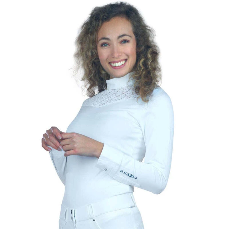 Zacht, licht, comfortabel en ademend, Flags&Cup poloshirts zijn ideaal voor wedstrijden. Met zijn ton-sur-ton kanten halslijn geeft de CASSIA wedstrijdpolo u een zeer vrouwelijke en elegante stijl voor wedstrijden. Ritssluiting aan de achterkant. Witte kraag versierd met een prachtig zilverkleurig F&C borduursel. Overhemdsmouwen met twee knopen. Silver Flags&Cup borduursel op linkermouw. Samenstelling: 95% polyester 5% elastische jersey.